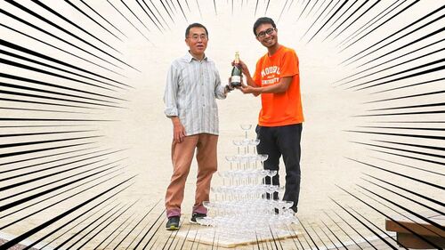 親孝行な息子、地主さんが、父の日にお酒を贈ってシャンパンタワーをつくります。