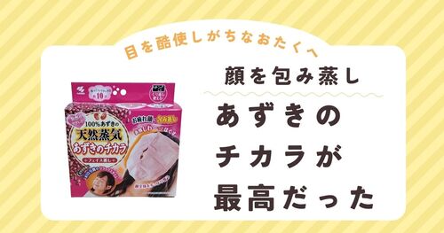 小林製薬「あずきのチカラ」のフェイス蒸しは、顔全体を包み蒸しにしてくれる商品。じんわりと温かく、顔全体をほぐしてくれます。パソコンやスマホの見すぎて目を酷使しがちな方におすすめです。