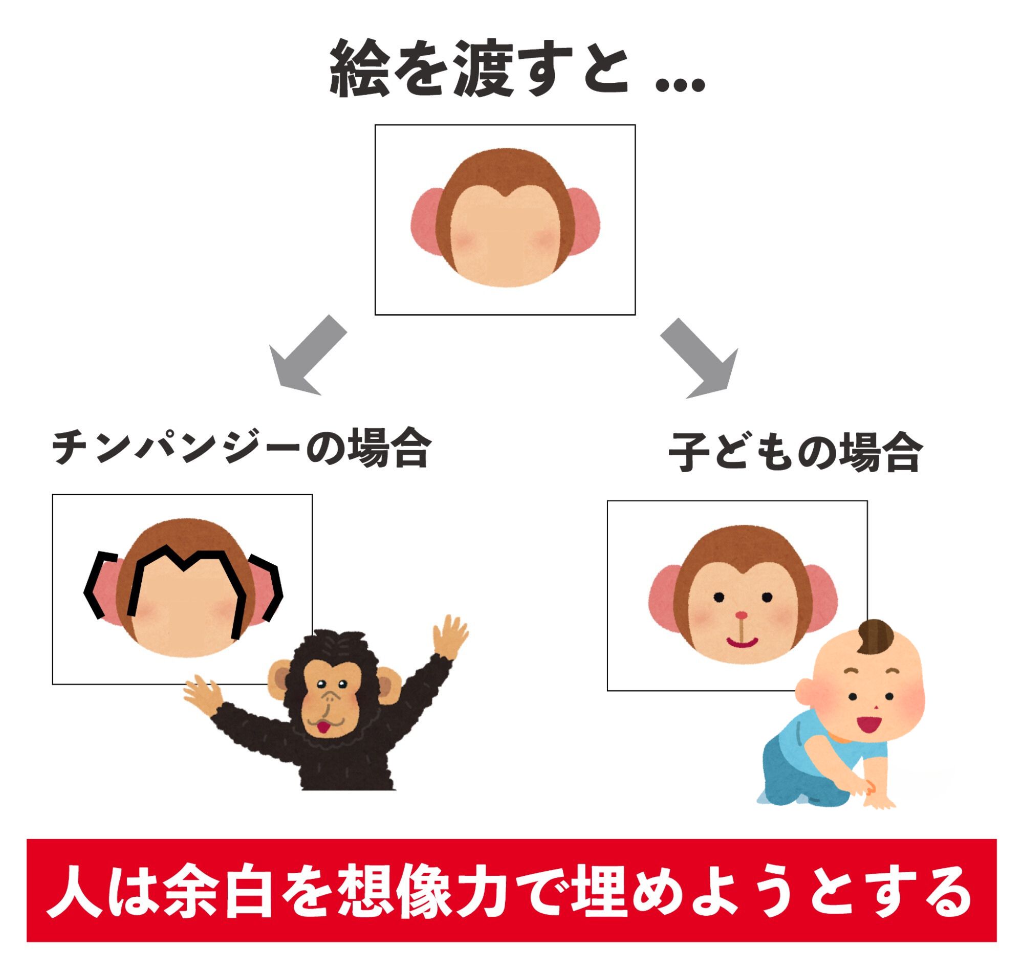 例えば、チンパンジーに顔の輪郭だけが描かれた紙を渡すと、ずっとその顔の輪郭をなぞっているだけです。けれど同じ紙を人間の幼児に渡すと、その顔の輪郭のなかに自分で目や鼻や口を描き始めるんですよ。