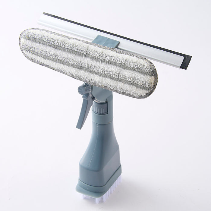 スプレー、モップ、ブラシ、スクイージーが一体になった窓ワイパー。ウィンドウブラシにスプレー機能が組み込まれています。